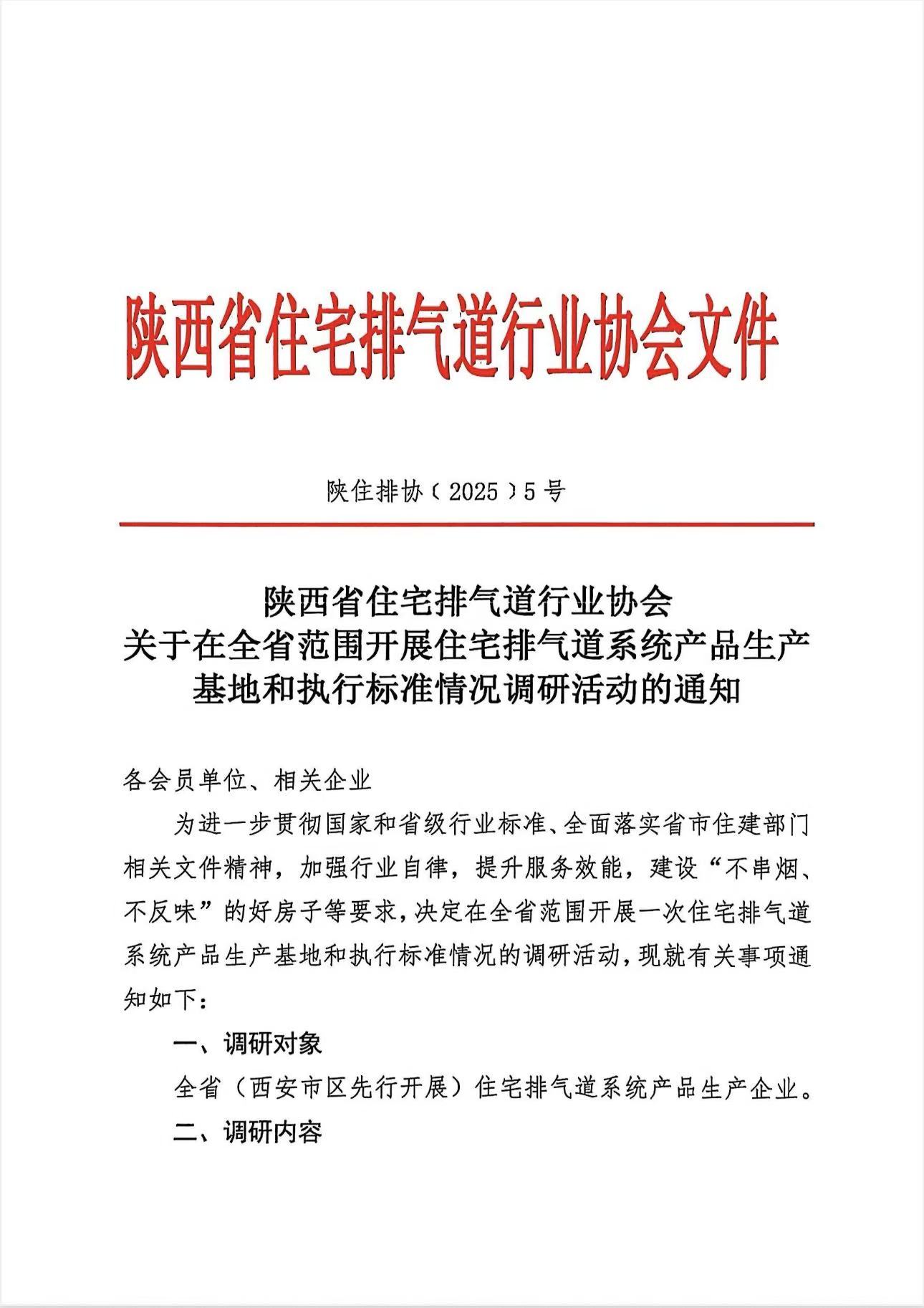 关于在全省范围开展住宅排气道系统产品生产基地和执行标准情况调研活动的通知